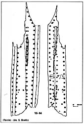 13+14) Due porzioni frammentate di corso di fasciame. Lungh. max cm 239; largh. max cm 35,5; alt. max cm 4,8. Distanza media fori per legatura cm 9; distanze tra i fori per collegamento ordinate cm 29 e 62,5. Riparazione per legatura lungo la linea di rottura tra le due porzioni e presenza in situ del cordolo di calafatura. Sulla faccia interna sono presenti impronte quadrangolari forse di puntelli. Spezzate alle estremità.