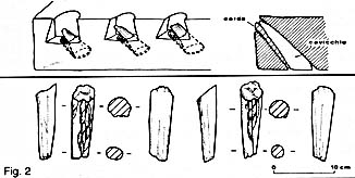 Gli spinotti hanno una forma rastremata terminante "a becco di flauto" e presentano segni sulla faccia rivolta verso la corda, forse di sgorbiatura (fig. 2).
